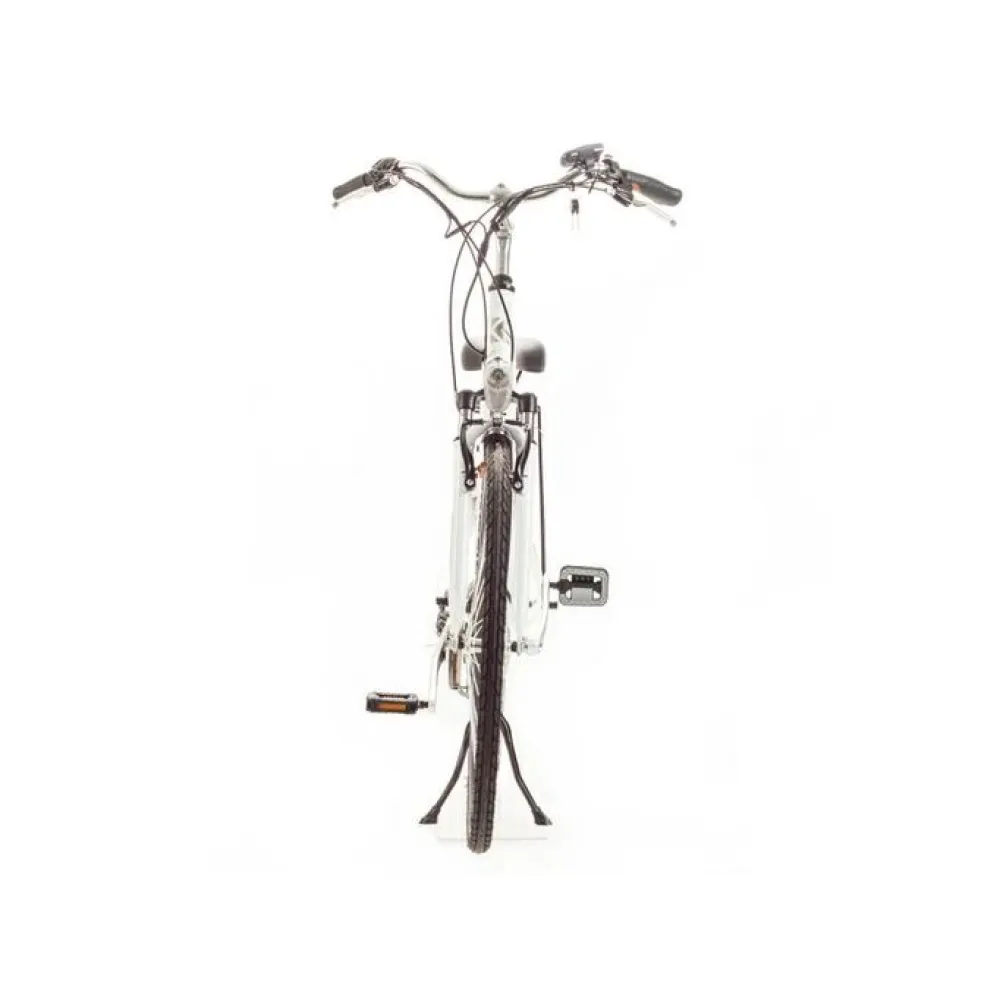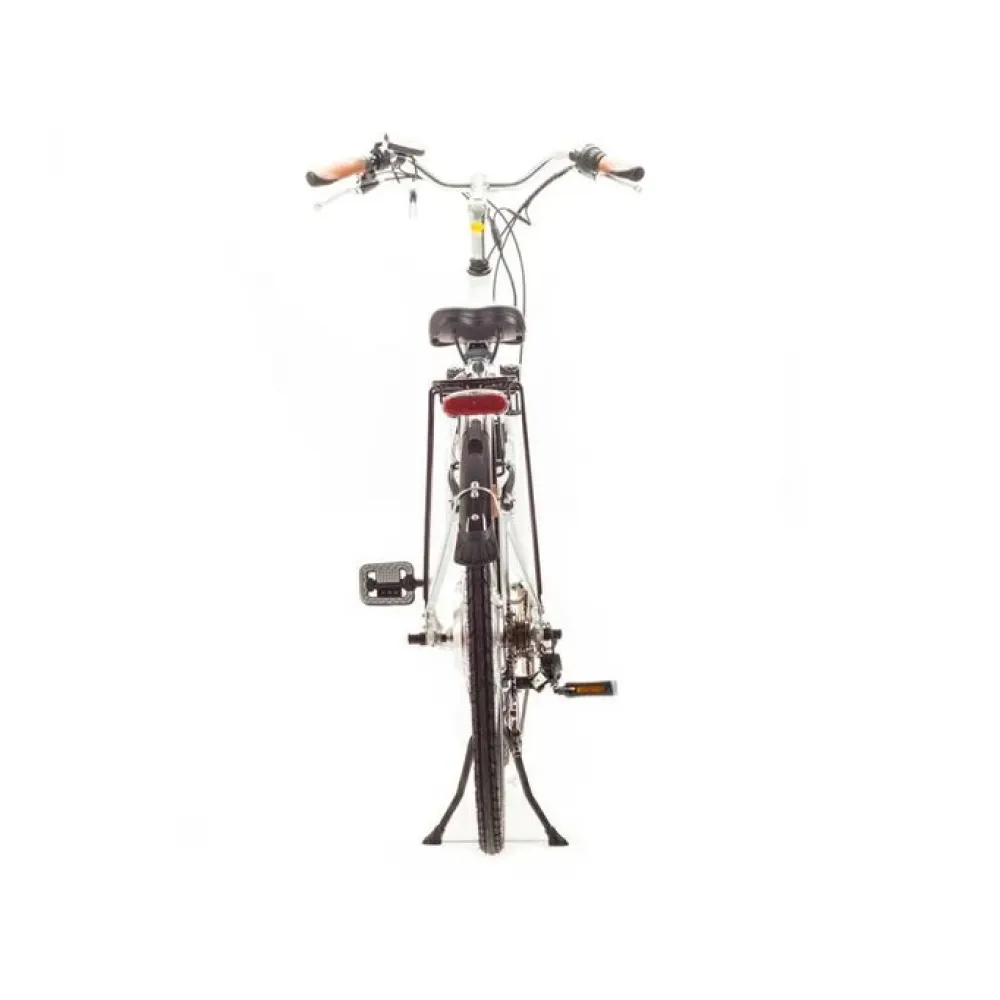 Алюминиевая конструкция рамы не складывается. Движок – мощный, на 350 Вт. Максимальные скоростные параметры приближается к 24 км/час. Емкости батареи достаточно для преодоления аналогичного расстояния. Комфортабельное седло повторяет анатомические части тела, не вызывает усталости при длительной езде. 7-скоростная трансмиссия переключается с помощью половинчатой ручки. Безопасность езды обеспечена наличием велодисплея и светодиодного современного освещения.