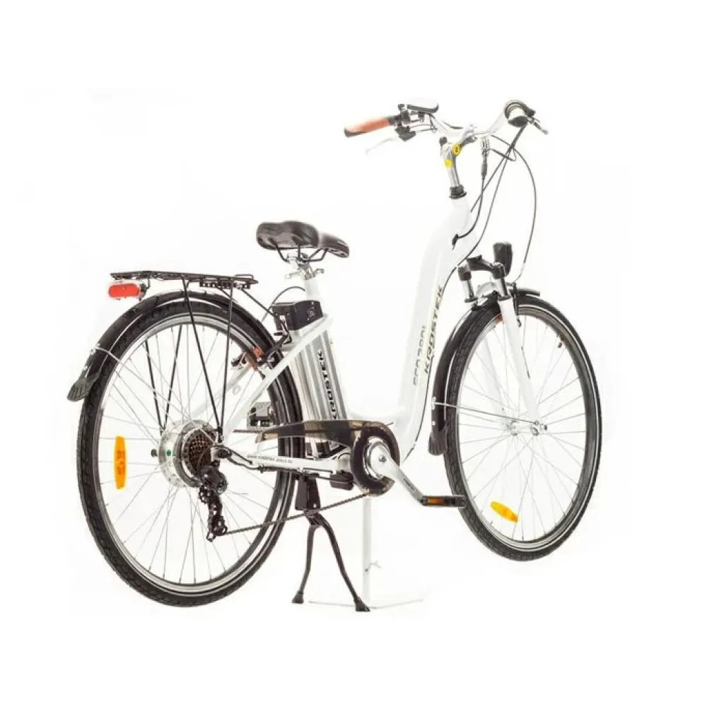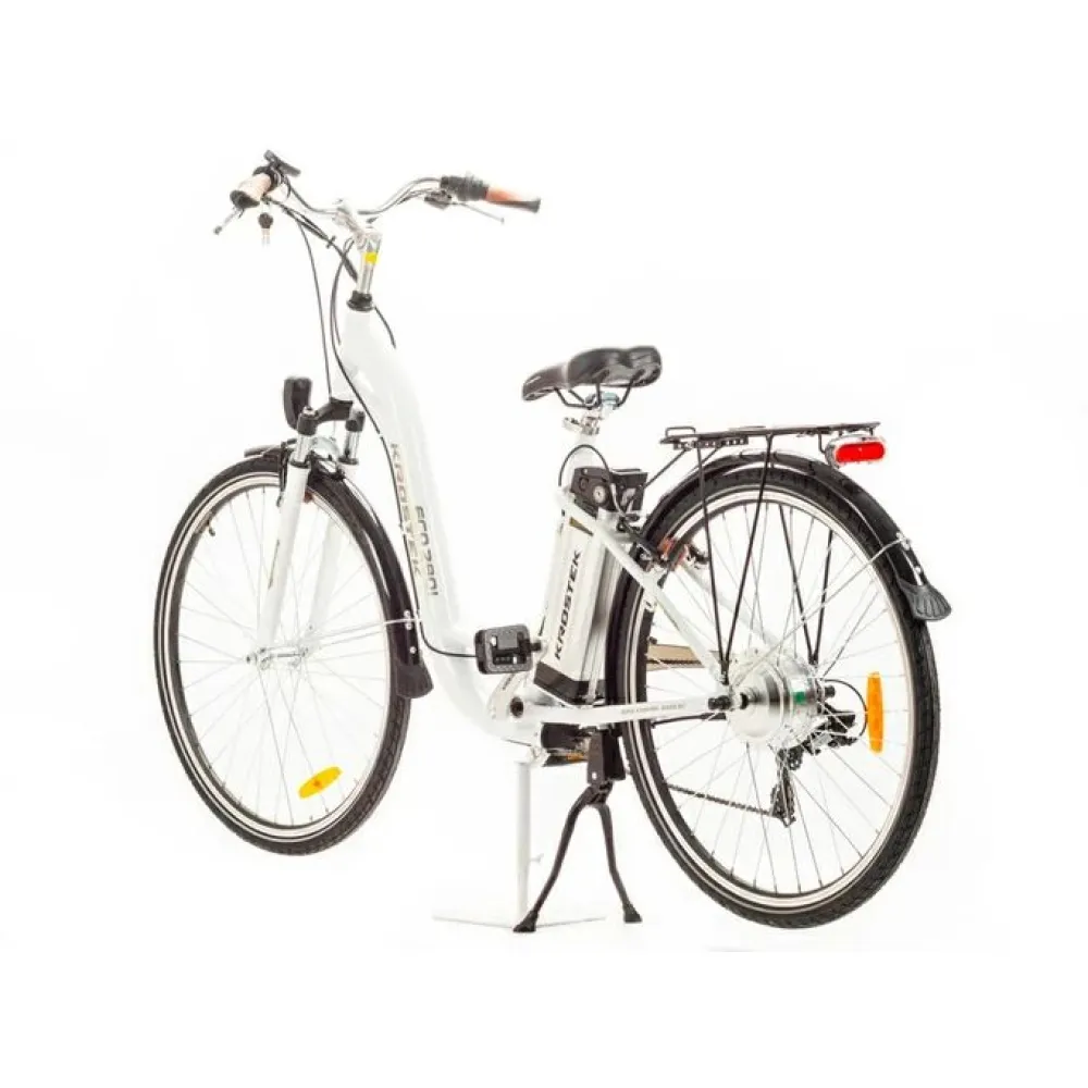 Электровелосипед KROSTEK ECO 2801  белый – городской вариант байка, способный кроме ровных поверхностей преодолевать 28-дюймовыми колесами с глубоким протектором кочки, неровности, песчаные и глинистые грунты. Техника считается вездеходной, идеально подходит для российских дорог. Приобрести модель сейчас, воспользоваться бесплатной консультацией, насладиться безотказностью технической части поможет сотрудничество с нашим интернет-магазином.
