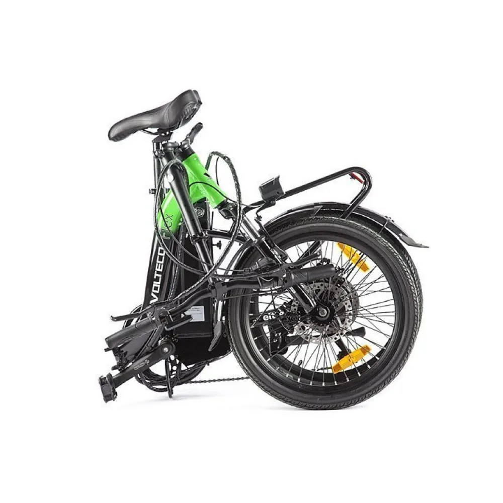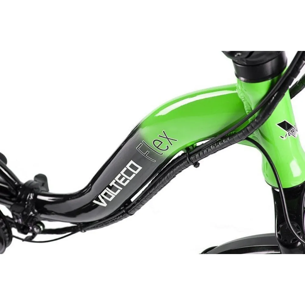 Велогибрид VOLTECO FLEX – складной вариант электровелосипеда для которого всегда найдется место в доме. Легкий по весу транспорт предназначен для езды по городской и загородной местности. Велик легко управляется, прост в обслуживании. Имеет длительный срок службы, не ломается благодаря оригинальной технической новинки. На этапе изготовления производитель позаботился о защите электровелосипеда, удобстве и безопасности ездока.  Предлагаемая нашим магазином модель в черно-зеленых цветовых оттенках выглядит стильно и современно. Из технических преимуществ стоит отметить следующие: